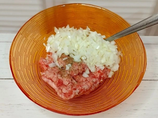 Смешайте фарш, лук, специи. Тщательно перемешайте.