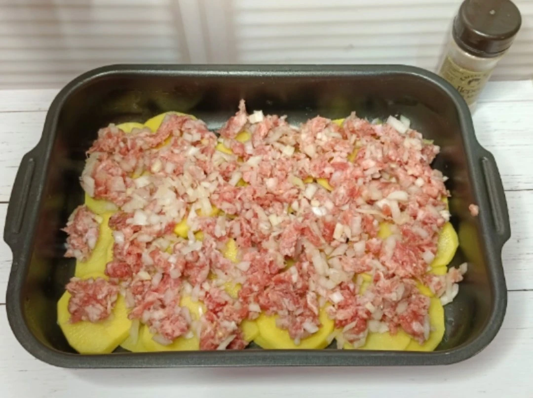 Смазанный маслом противень застелите пергаментом, выложите слоями половину картофеля, затем фарш, затем снова картофель.
