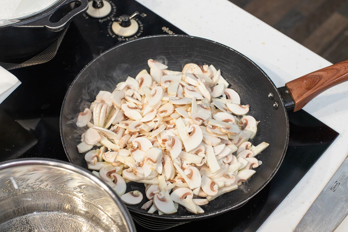 Грибы нарежьте тонкими ломтиками. Разогрейте сковороду с растительным маслом и обжарьте грибы до золотистого цвета, периодически помешивая.