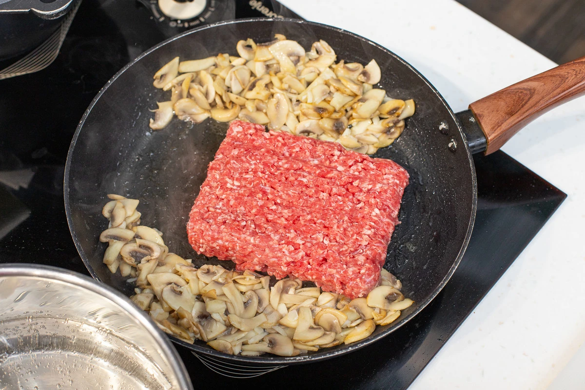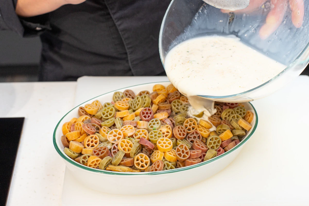Выложите в форму для запекания половину фарша, затем половину макарон, оставшийся фарш и оставшиеся макароны.