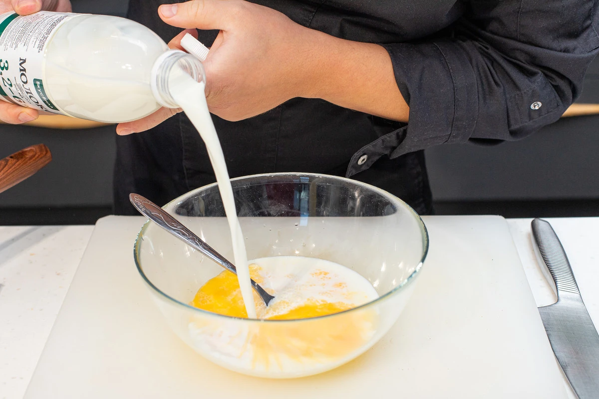 Смешайте яйца с молоком, посолите, поперчите. Добавьте мелко нарезанный чеснок и листья тимьяна. Перемешайте.