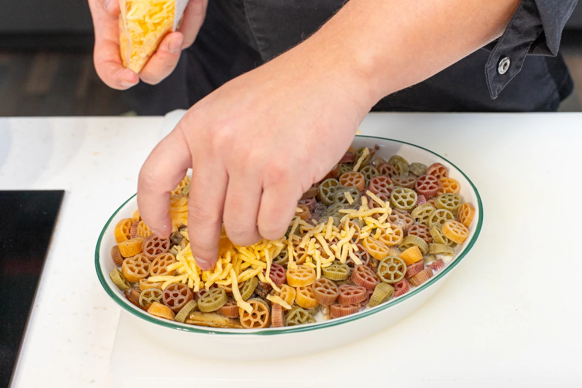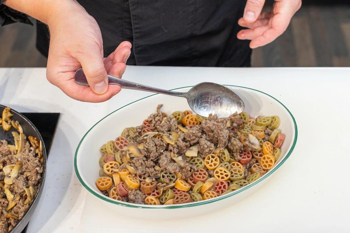 Новая версия советского лапшевника — с модными разноцветными макаронами, фаршем и грибами. Ну чем не лазанья?