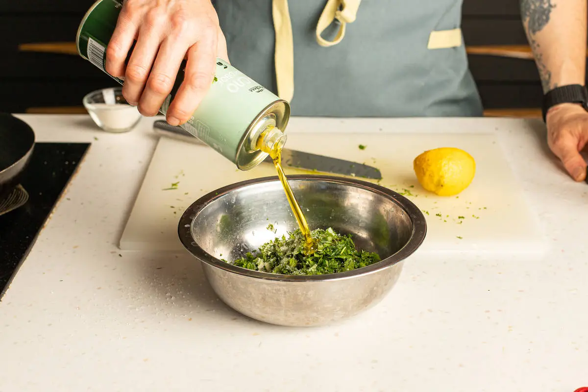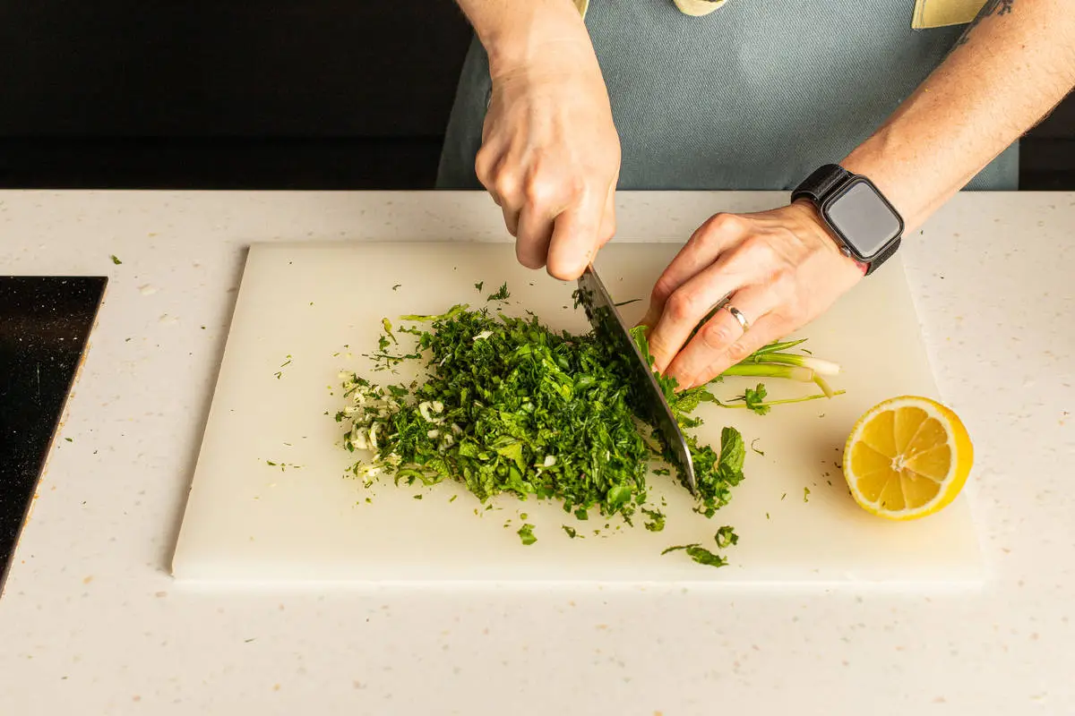 Зелень помойте, обсушите и нарежьте очень мелко. Пройдитесь ножом несколько раз, чтобы получилась почти однородная масса.