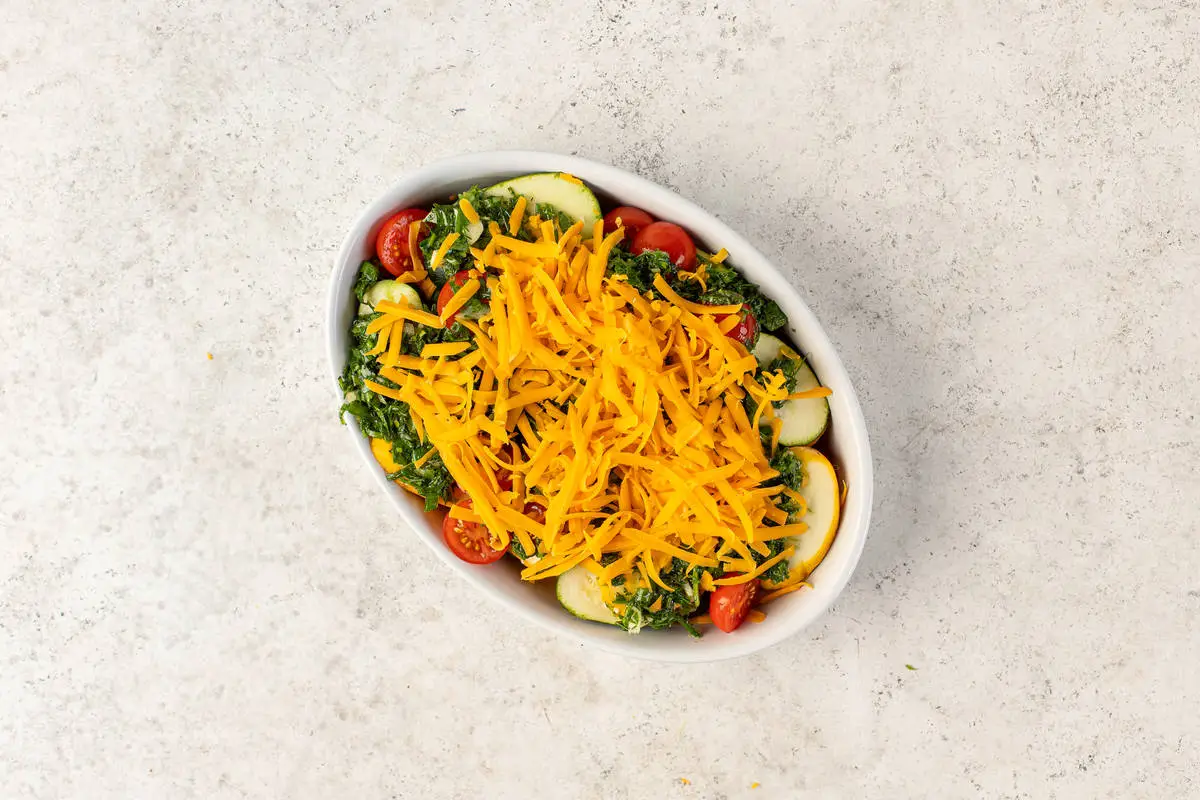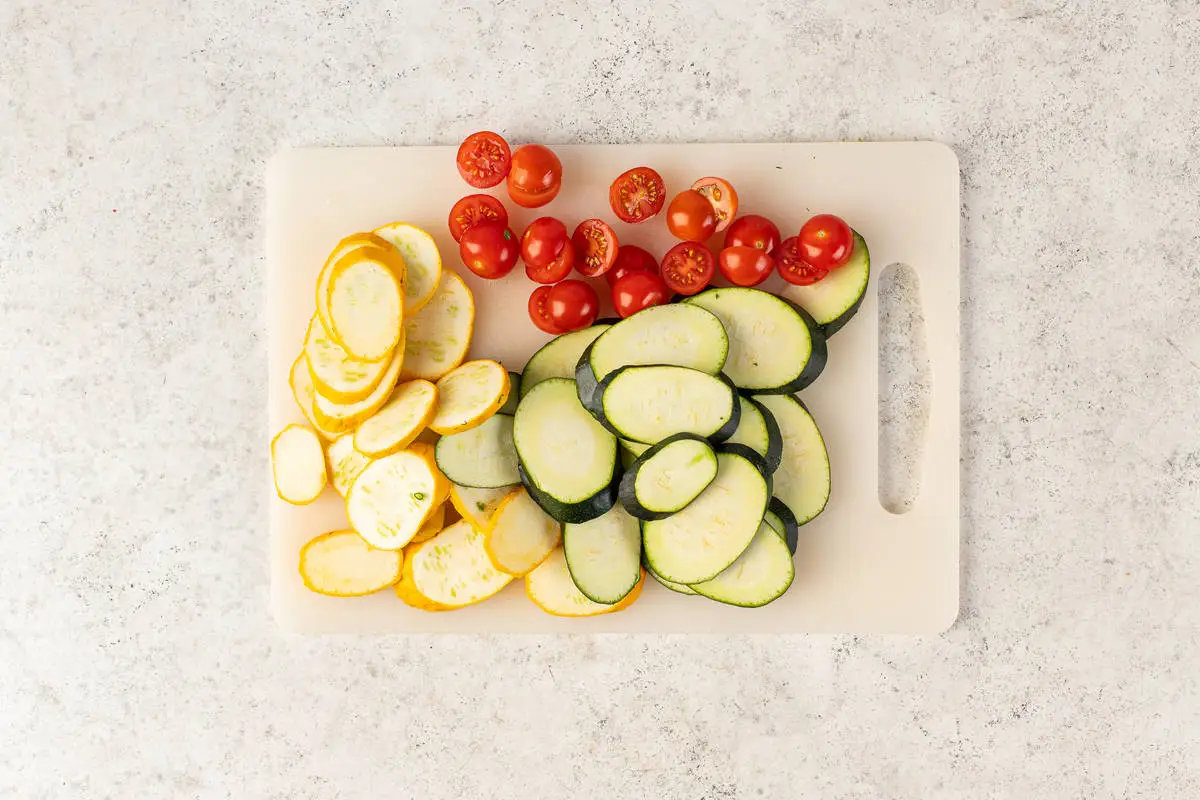 Чеддер измельчите на крупной тёрке, кабачки и цукини нарежьте кружочками, томаты черри разрежьте пополам.