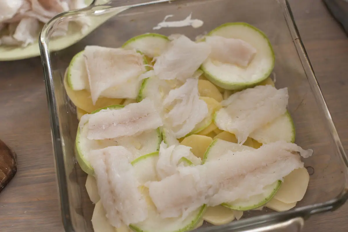 Филе трески нарежьте вдоль тонкими пластами. Картофель и кабачок порежьте тонкими кружочками (картофель совсем тонко, а кабачок потолще).
