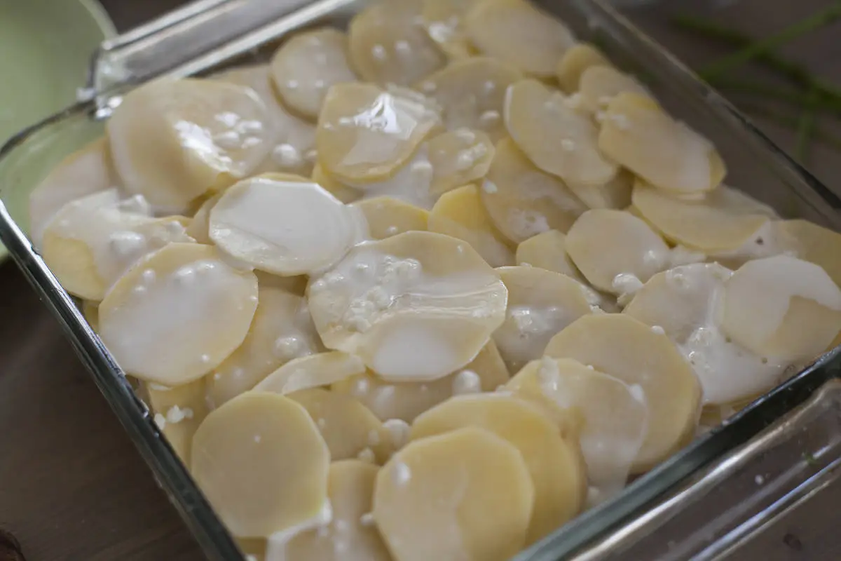 Залейте все слои смесью сливок и сметаны с чесноком, накройте форму фольгой. Запекайте в духовке при 180 С 30-40 минут, пока запеканка не будет легко протыкаться вилкой, посыпьте тертым сыром и подержите еще 10 минут. Готово!