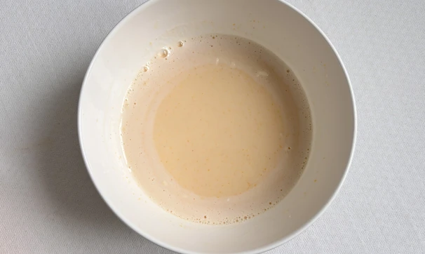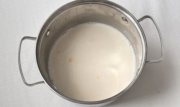 Добавьте 200 мл молока комнатной температуры и муку. Тщательно перемешайте крем, чтобы избежать образования комочков.