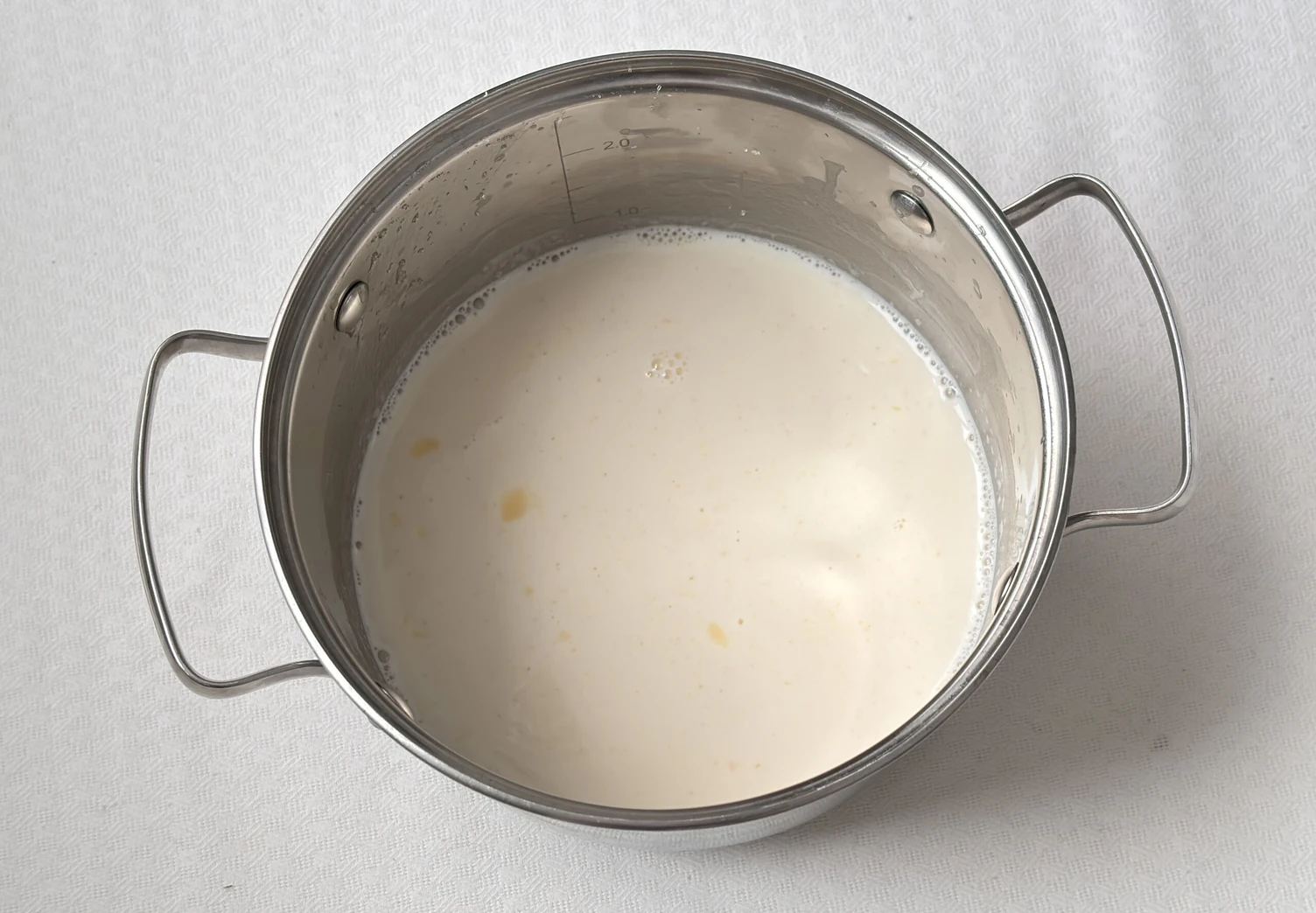 Перелейте крем в сотейник и поставьте на средний огонь, постоянно помешивая. Когда крем начнет густеть, сразу добавьте оставшееся молоко. Уваривайте крем до кипения.