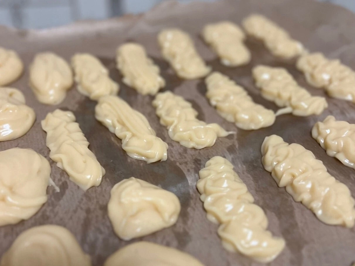 Переложите тесто в кондитерский мешок и выдавите на застеленный пергаментом противень небольшие колбаски.