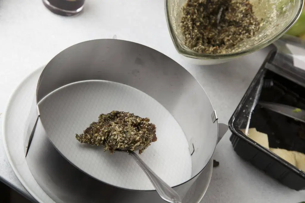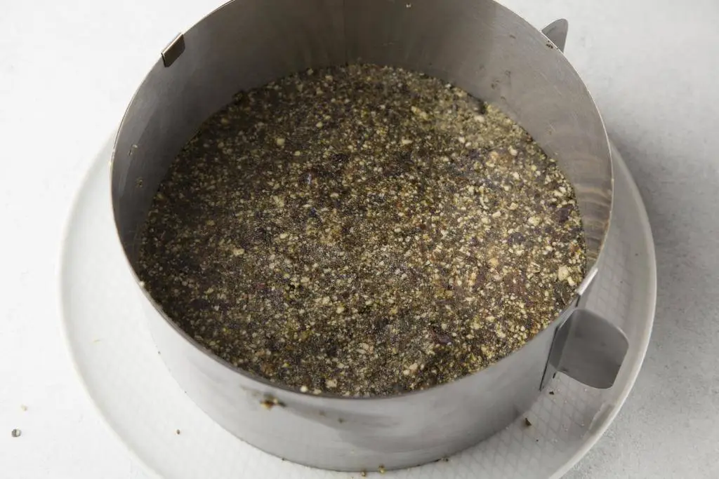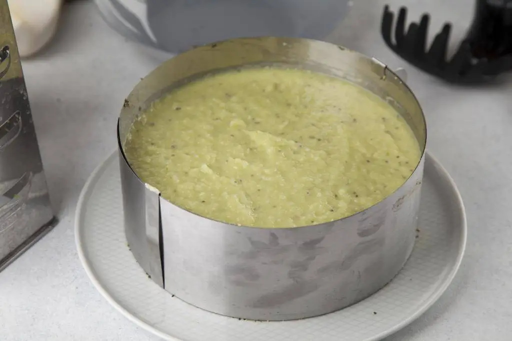 Выложить ее в разъемную форму (или использовать кулинарное кольцо) диаметром примерно 20 см. Отставить в сторону.