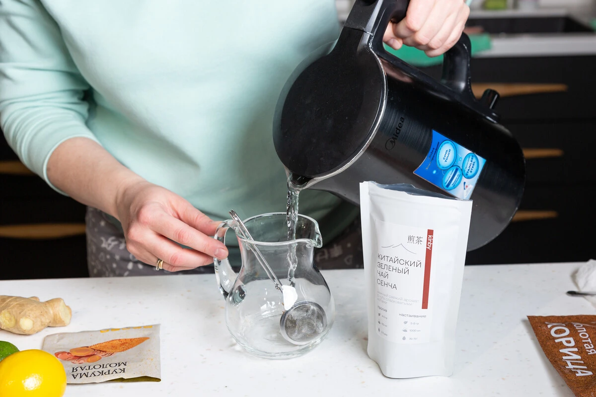 Заварите пакетированный зелёный чай в горячей воде и дайте ему настояться 3–5 минут.