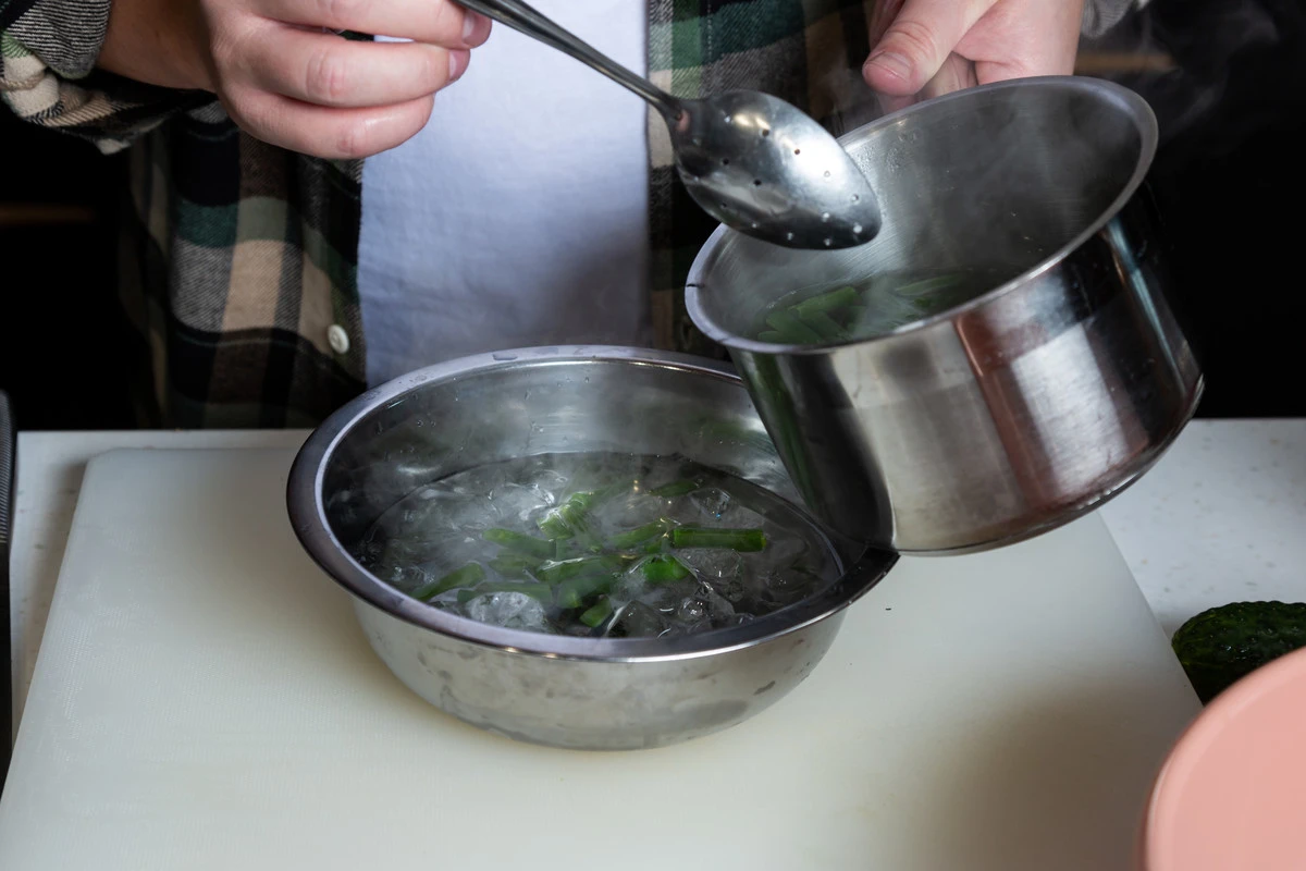 Фасоль бланшируйте в кипящей подсоленной воде. Откиньте на сито и переложите в холодную воду, можно даже в миску со льдом и водой — так фасоль сохранит более яркий цвет.
