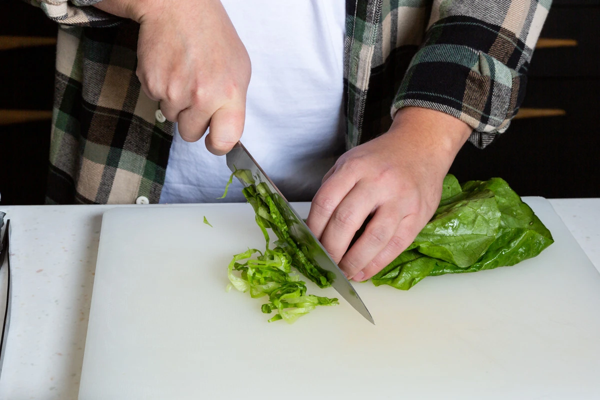 Салат романо промойте, обсушите и нашинкуйте мелко. Переложите в миску.