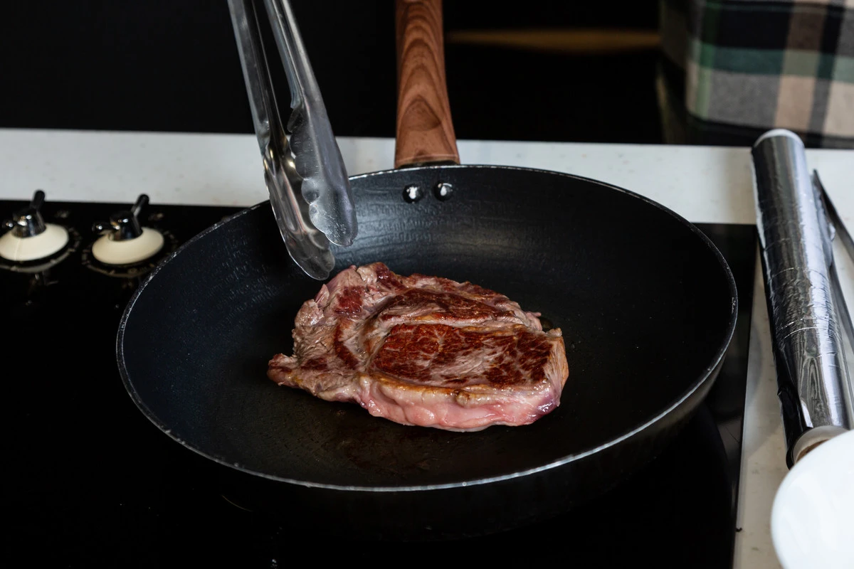 Хорошо разогрейте сухую сковороду. Выложите в неё стейк и жарьте по 3 минуты с каждой стороны.