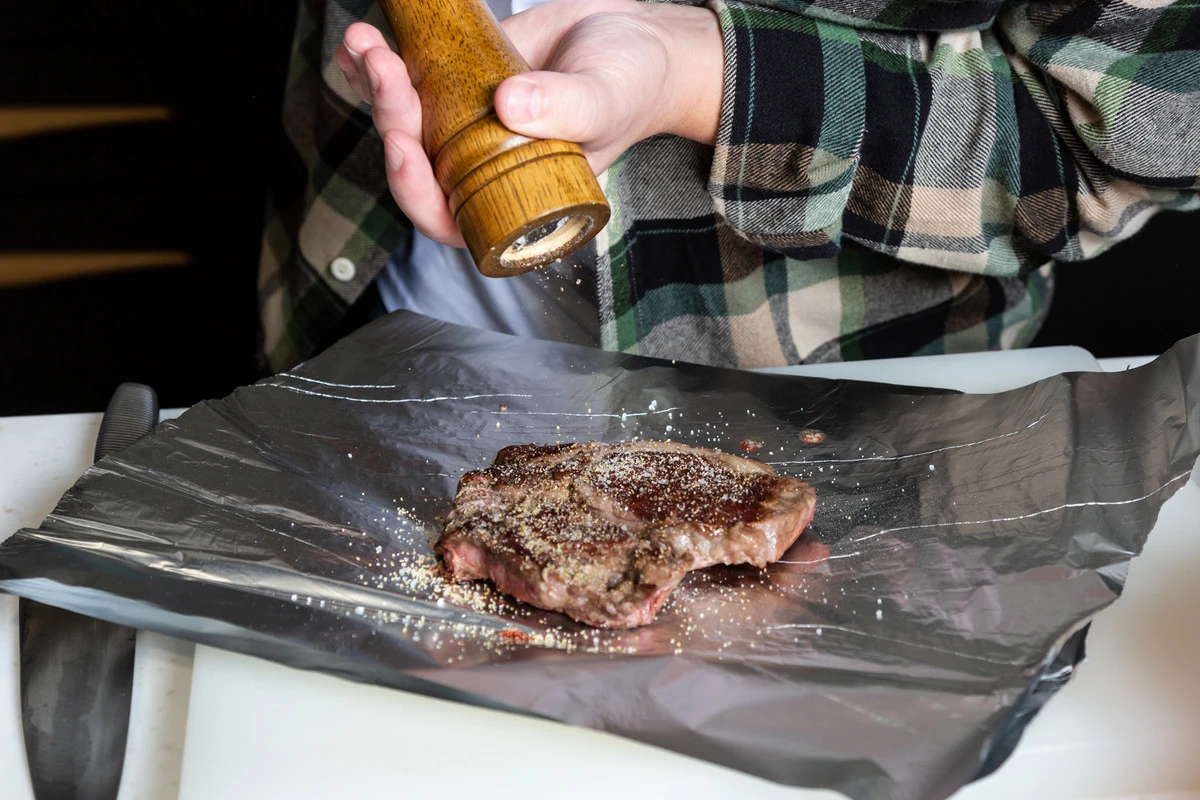 Переложите готовые стейки на фольгу, посолите, поперчите, добавьте сухой чеснок. Заверните в фольгу и дайте отдохнуть 3 минуты.