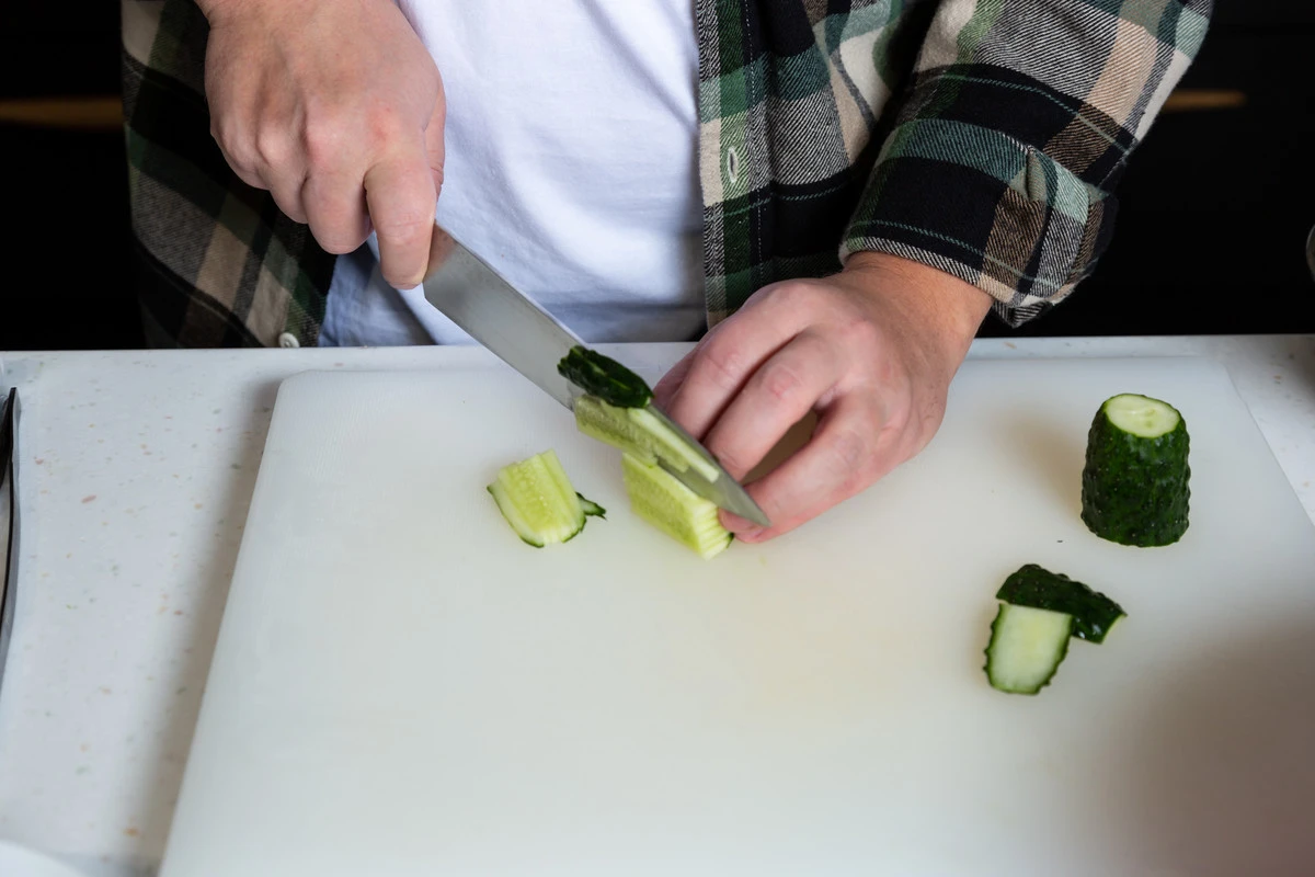 У огурца срежьте плодоножку и нарежьте овощ тонкой соломкой. Смешайте в миске нарезанный романо, огурец и зелёную фасоль.