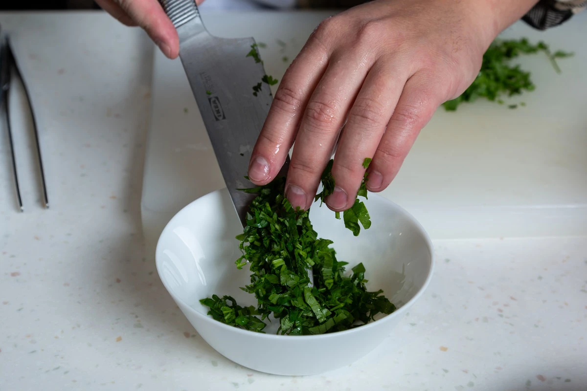 Петрушку и кинзу промойте, обсушите и мелко нарежьте.