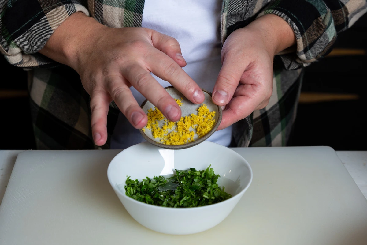 Сделайте заправку: смешайте в миске нарезанную зелень, сок лимона, лимонную цедру и масло. Соедините половину заправки с романо, огурцом и фасолью.