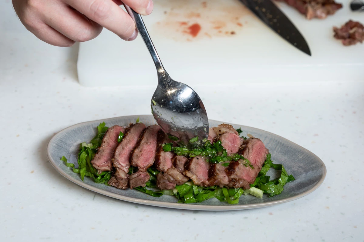 Стейки нарежьте тонкими ломтиками. Выложите на тарелку зелёные ингредиенты, сверху — ломтики стейка. Полейте оставшейся заправкой и подавайте.