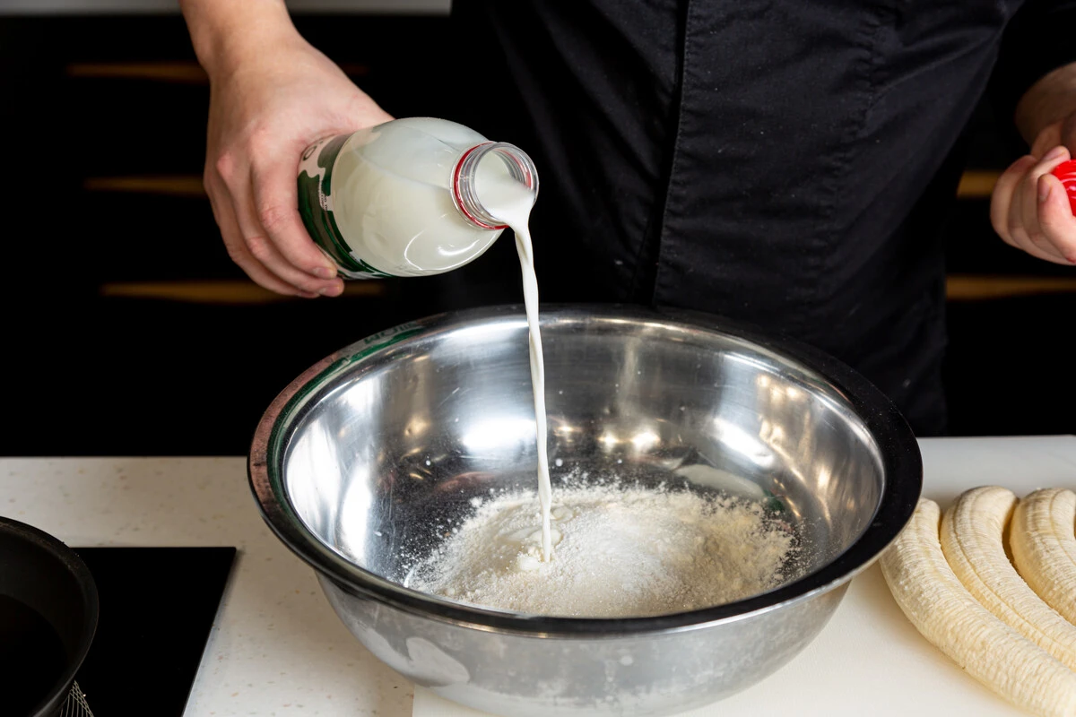 Приготовьте кляр из молока, муки, соли, сахара, ванилина и разрыхлителя.