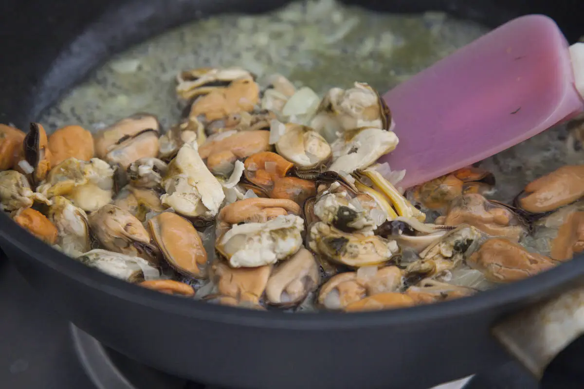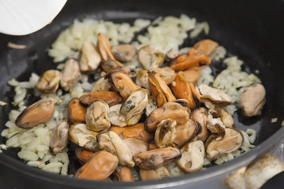 Лук мелко нарежьте и обжарьте на оливковом масле до прозрачности, затем выложите мидии и жарьте еще минуту на сильном огне.