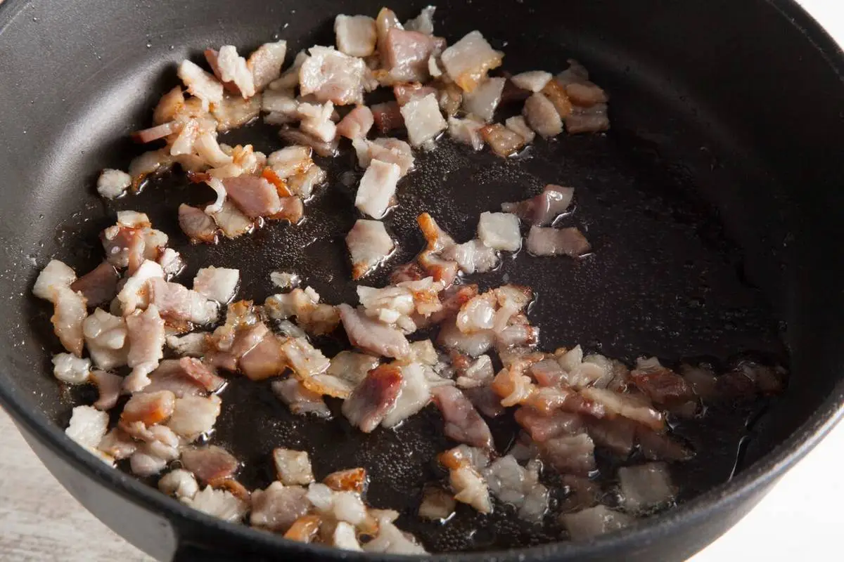 Грудинку нарежьте небольшими кусочками и выложите на сухую сковороду, готовьте на несильном огне под крышкой до вытапливания жира.