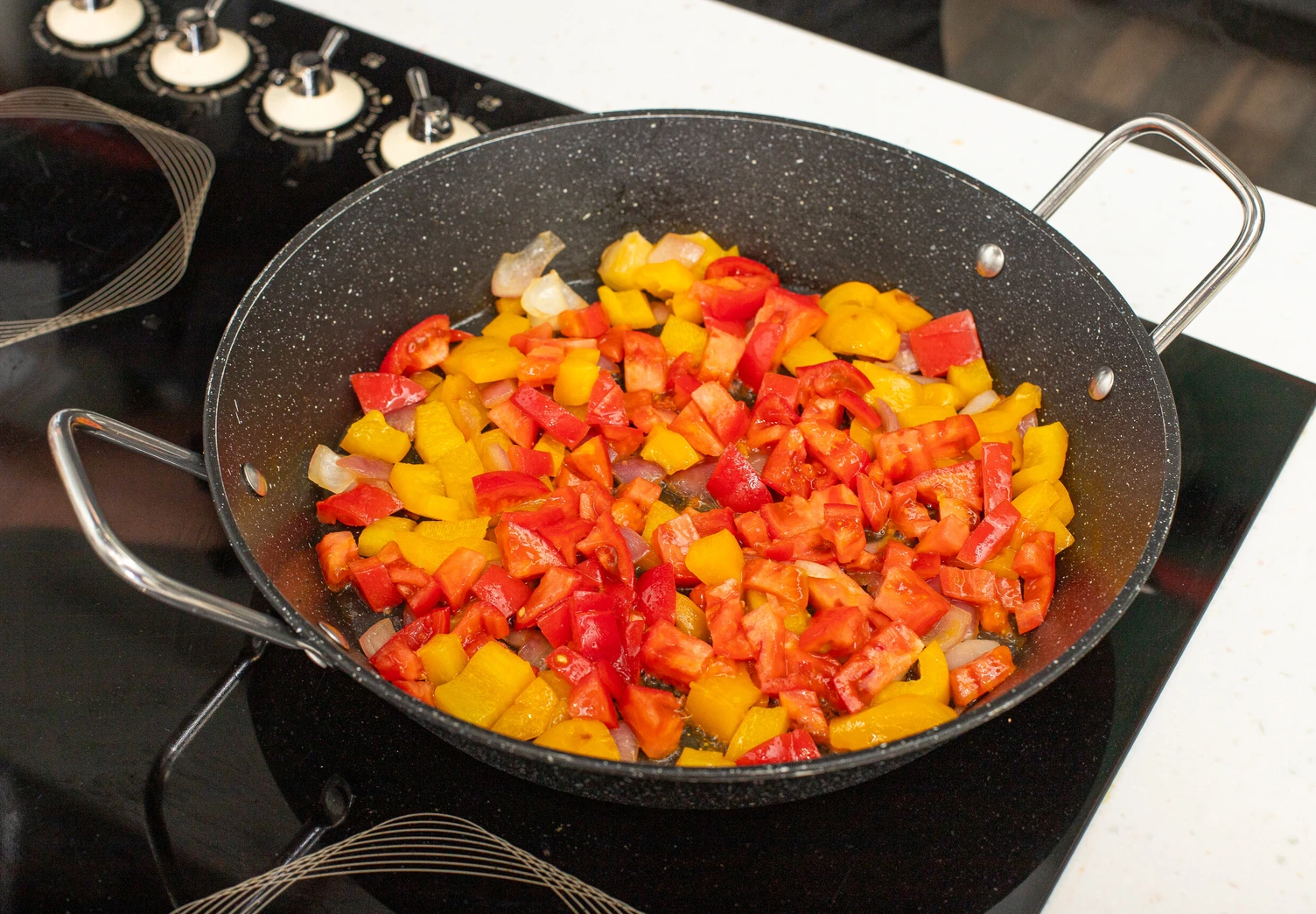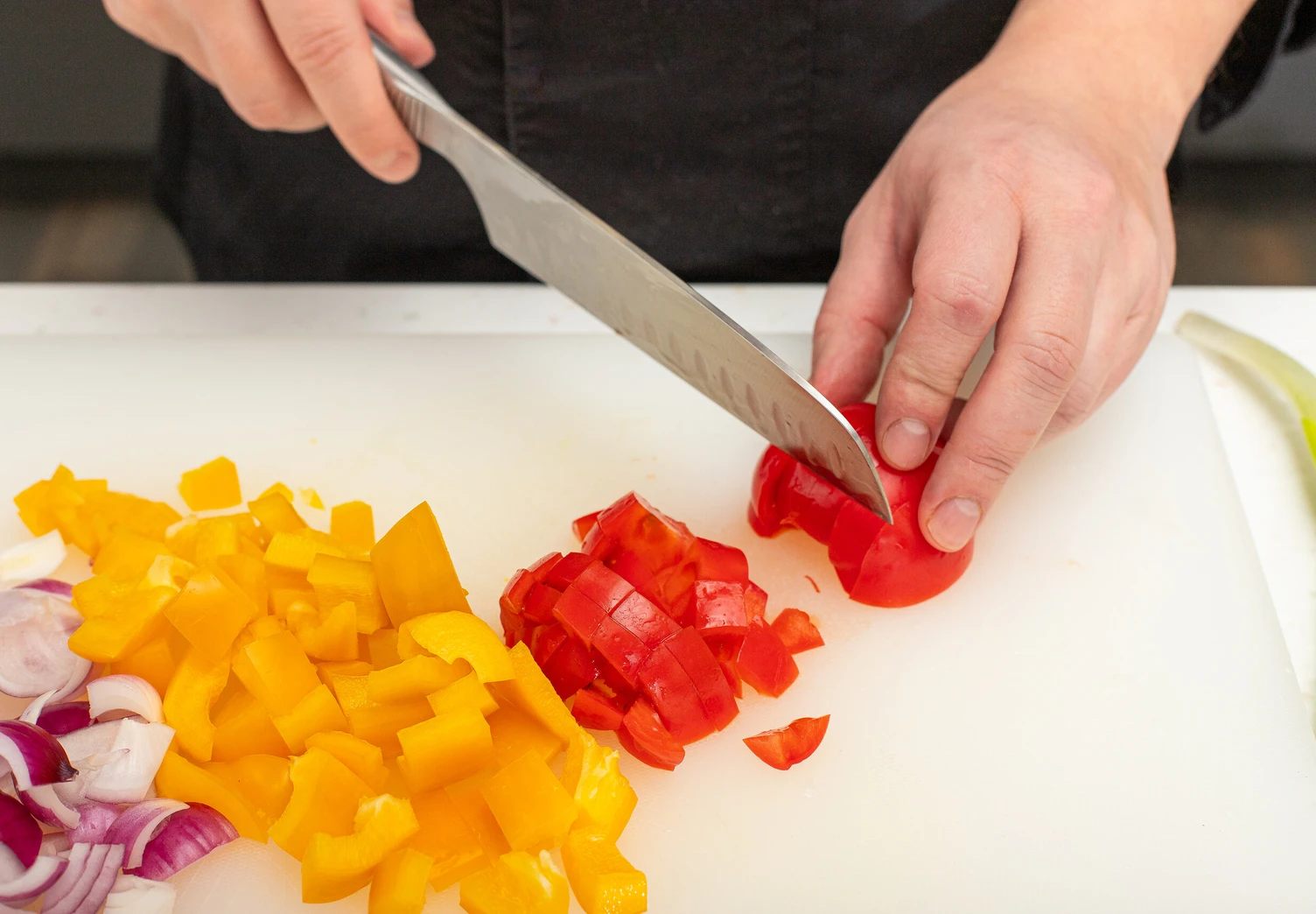 Нарежьте томаты, перец и красный лук средним кубиком. Зелёный лук нарежьте крупными перьями по 5–6 см.