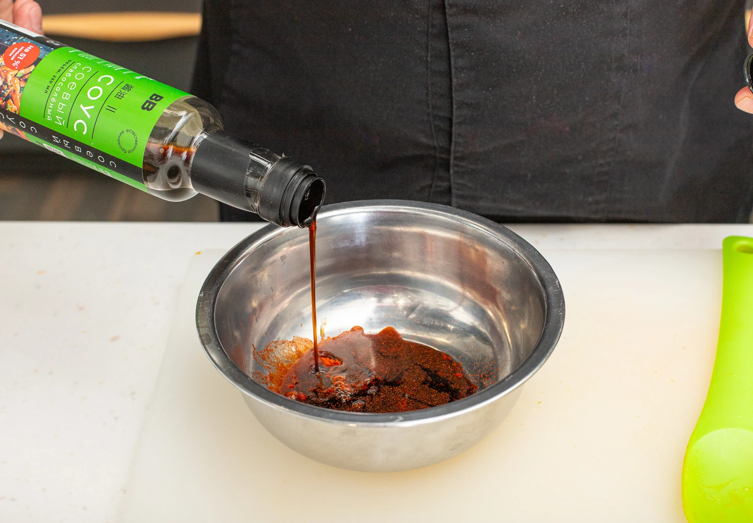 Сделайте смесь из соевого соуса, паприки, чёрного перца и шрирачи.