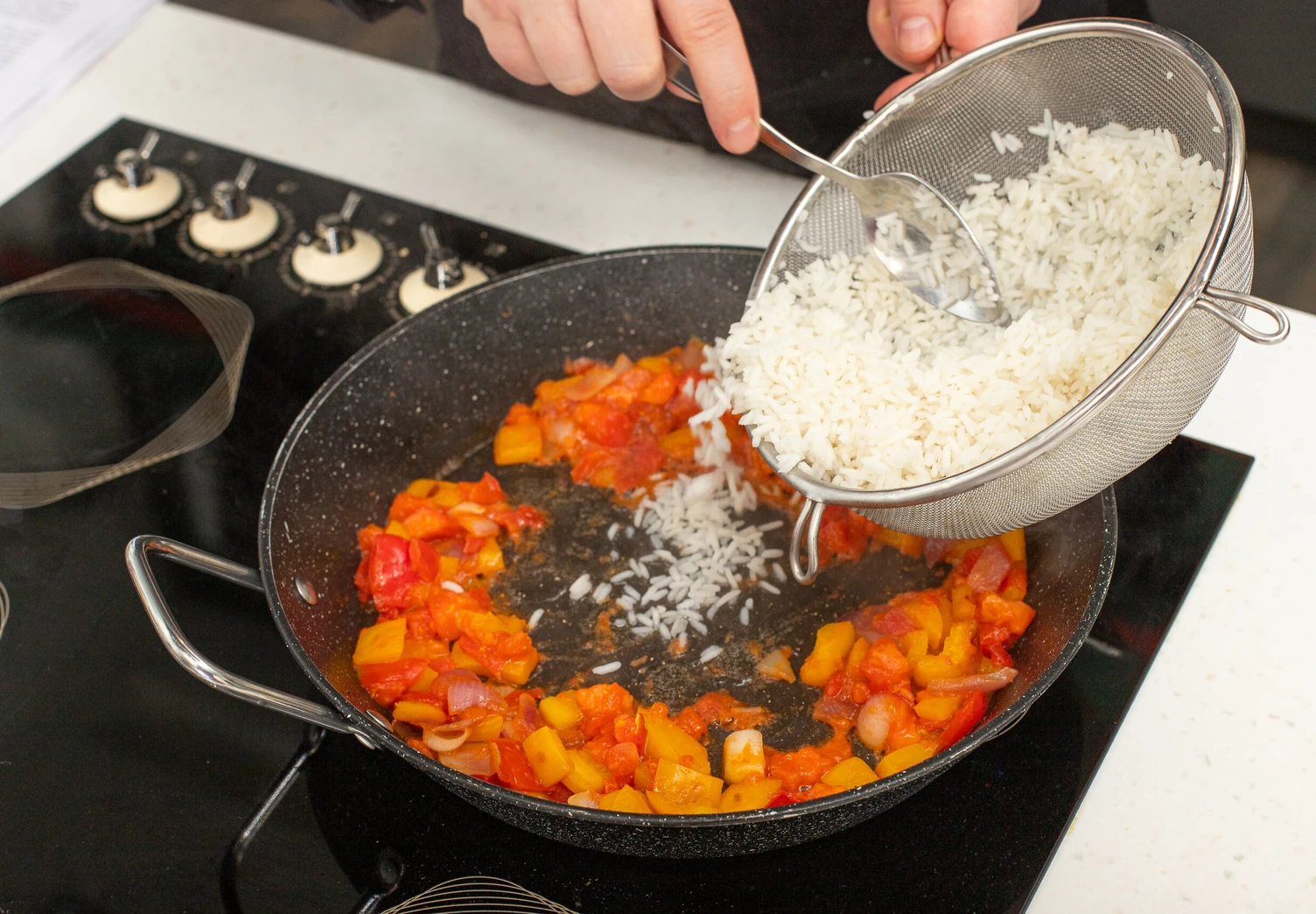 Добавьте к овощам готовый рис и перемешайте. Обжаривайте вместе ещё несколько минут.
