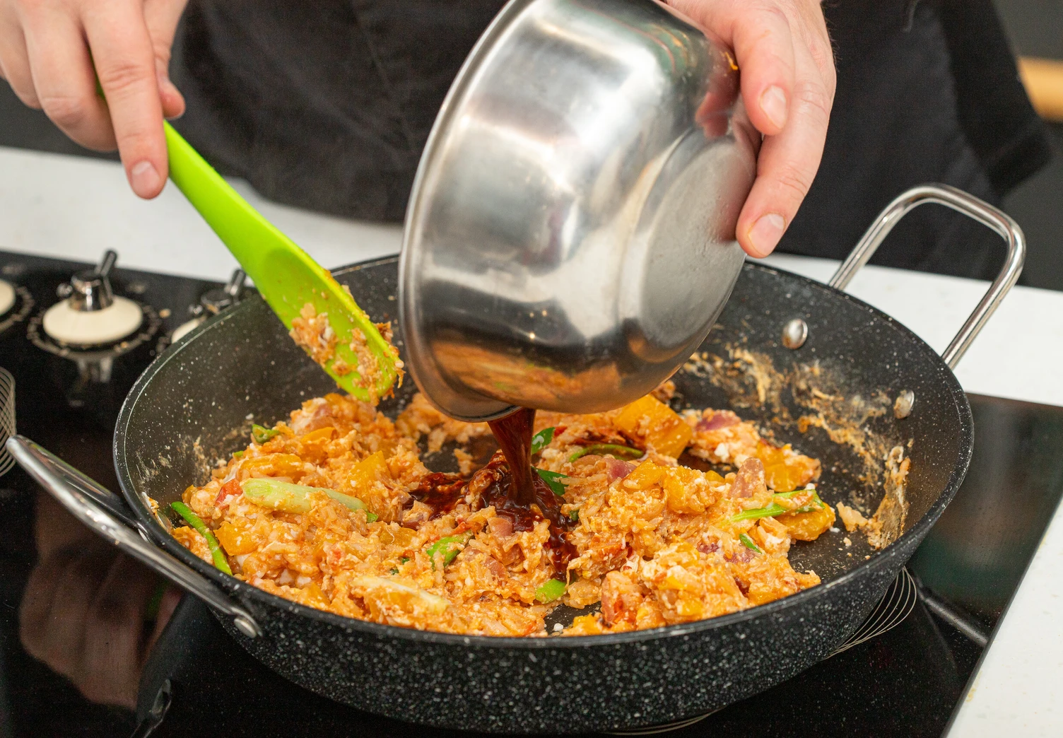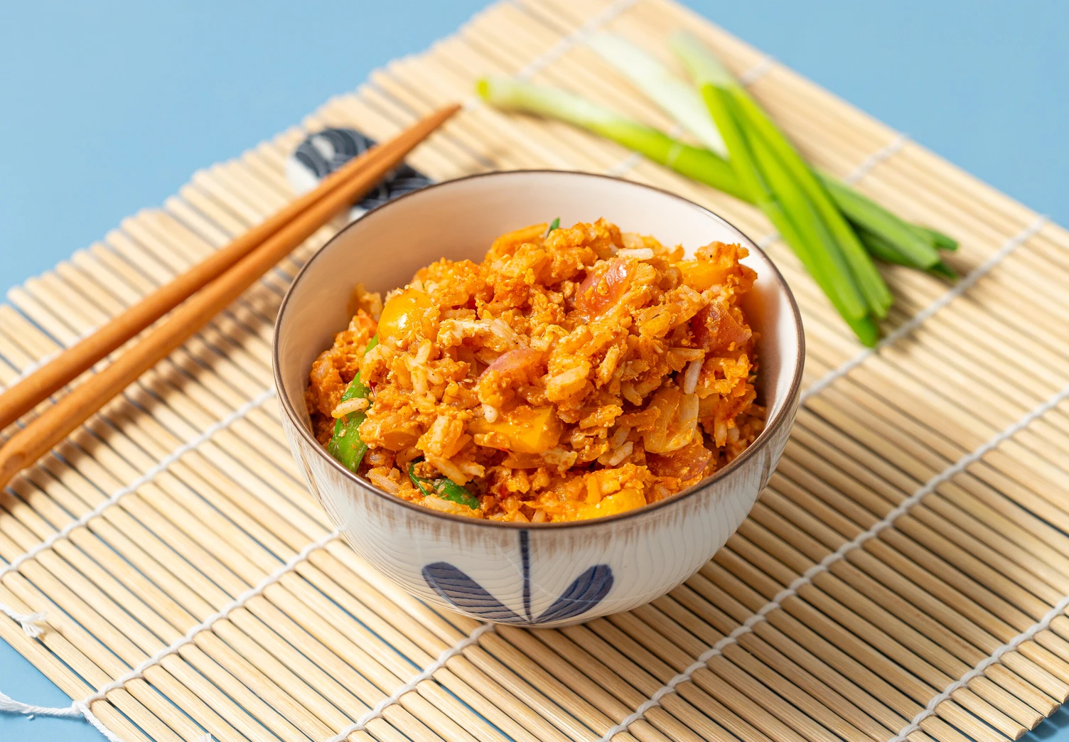 Ещё одно блюдо, популярное на юге Китая. Регулировать остроту риса можно количеством соуса шрирача: добавьте больше или меньше в зависимости от ваших вкусовых предпочтений. По желанию добавьте в блюдо жареные креветки или курицу.