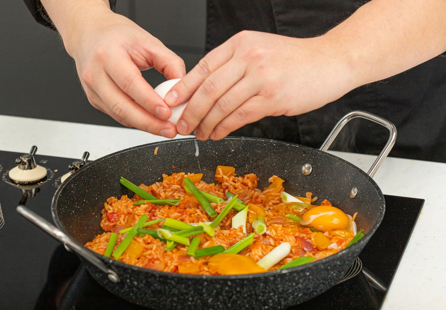 Сверху разбейте яйца и аккуратно вмешивайте их в рис в течение 2–3 минут.