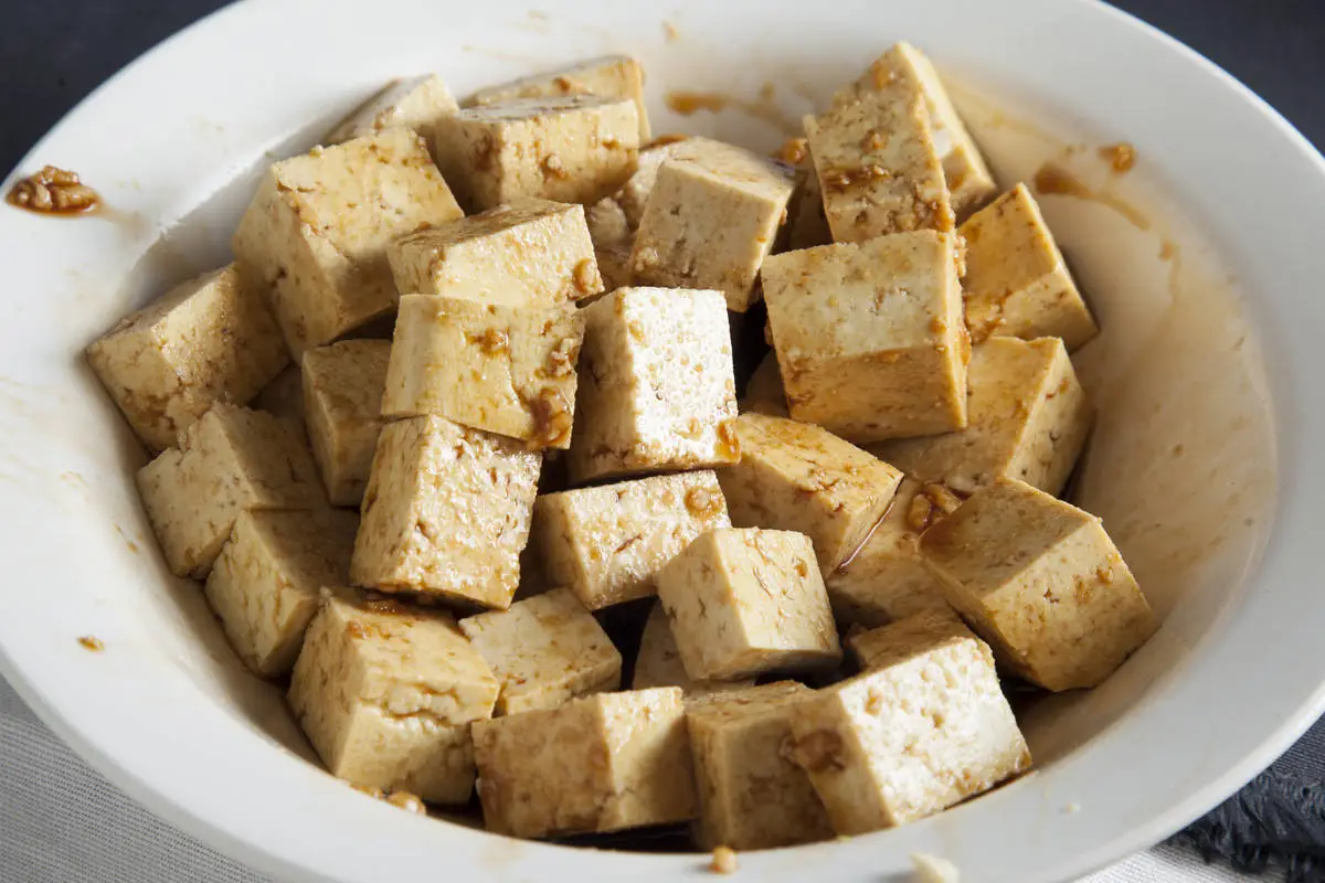 Тофу нарежьте кубиками и залейте получившимся маринадом, оставьте при комнатной температуре.