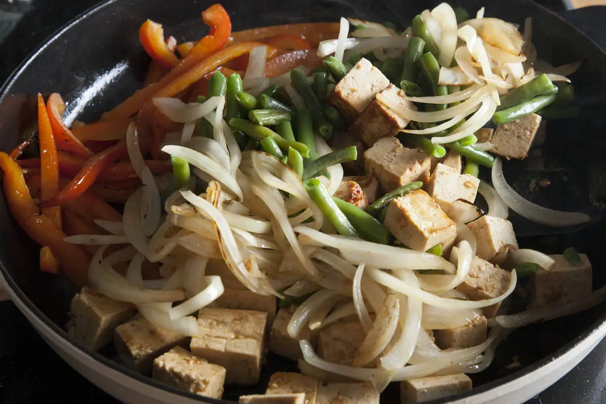 Затем обжарьте болгарский перец, верните в сковороду лук, добавьте фасоль и тофу вместе с маринадом, прогрейте всё вместе 2-3 минуты, по желанию можно добавить ещё соевого соуса. Подавайте горячим!