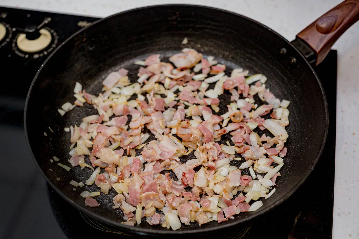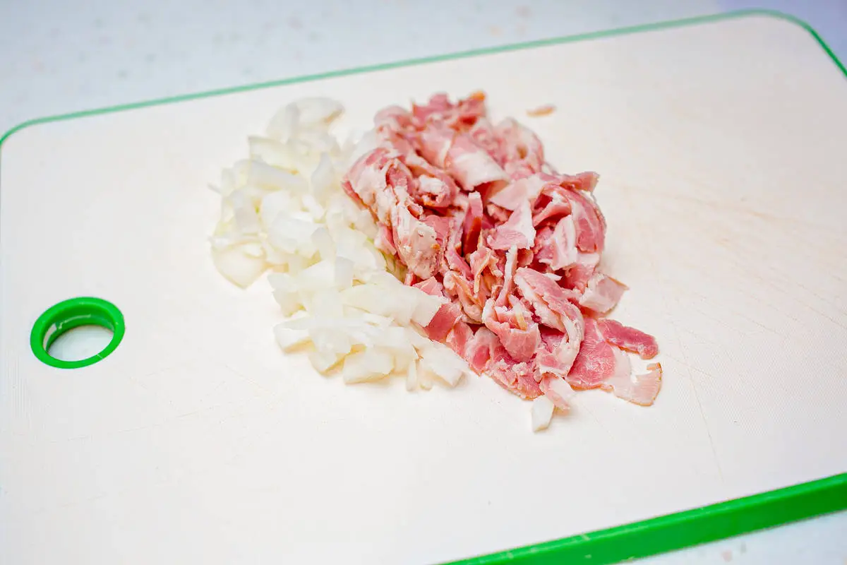 Бекон измельчите, лук нарежьте кубиками.
