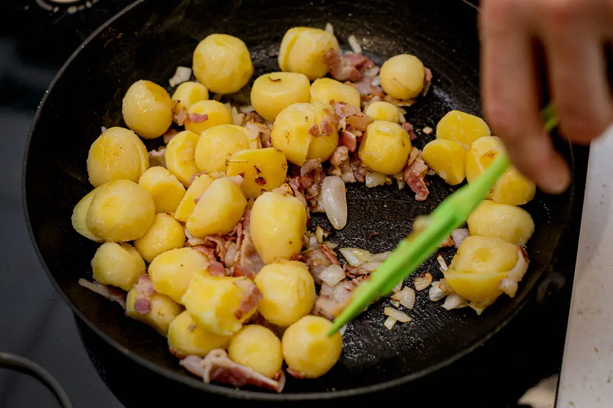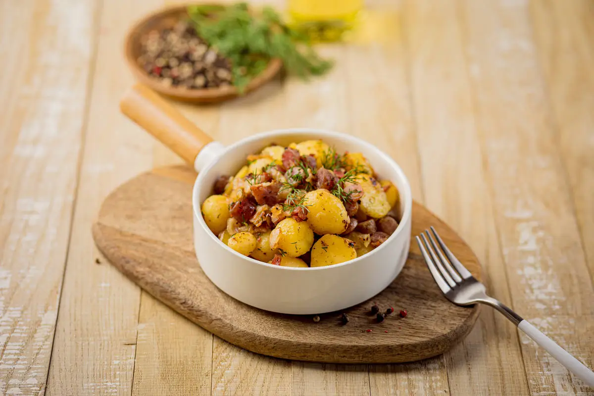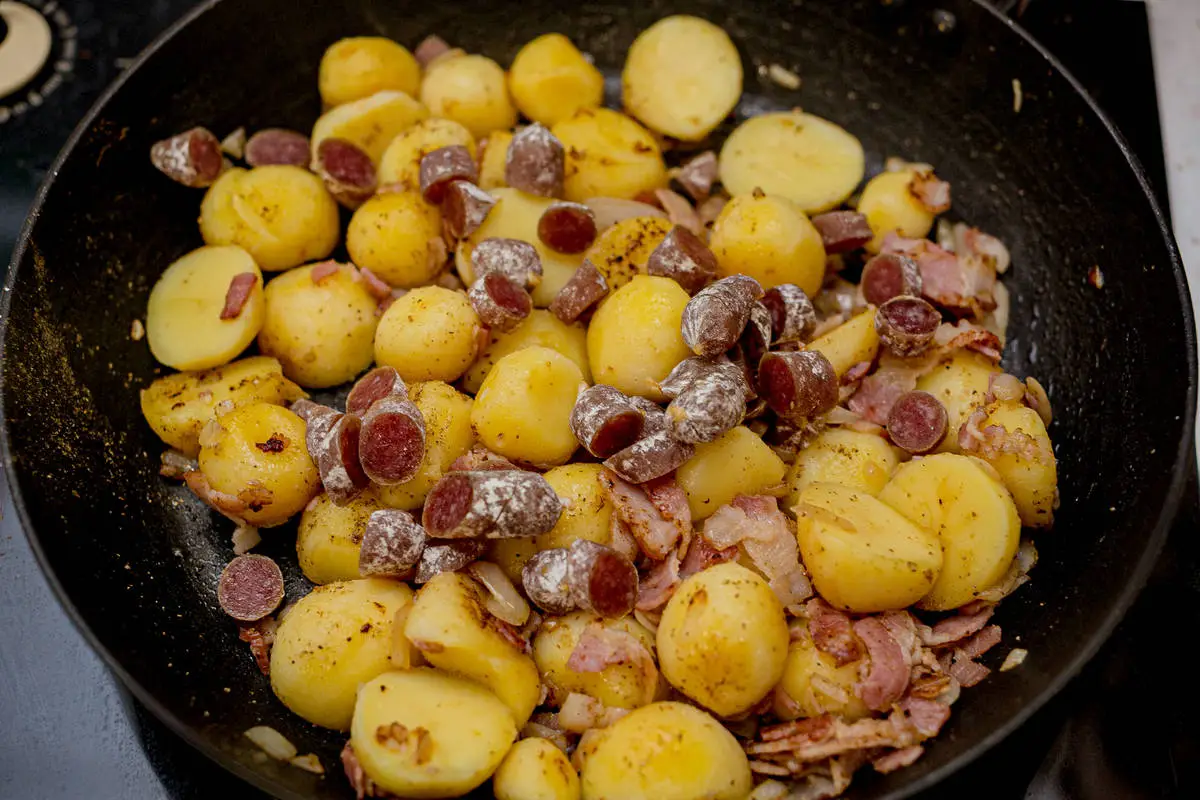 Колбаски нарежьте кружочками и добавьте к картофелю, прогрейте всё вместе ещё минуту. Попробуйте, прежде чем солить, так как бекон и колбаски достаточно солёные.