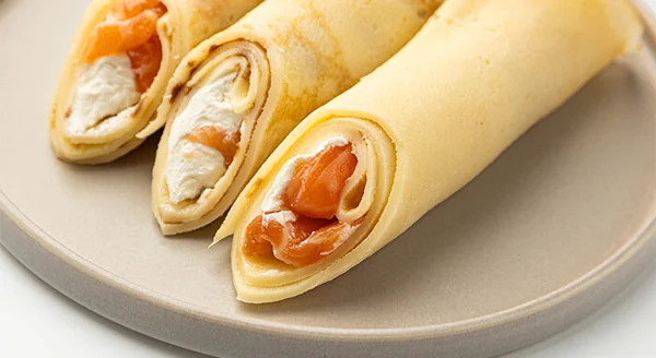 Пшеничные блины на молоке со слайсами слабосолёной сёмги и мягким сливочным сыром. Идеальное сочетание!