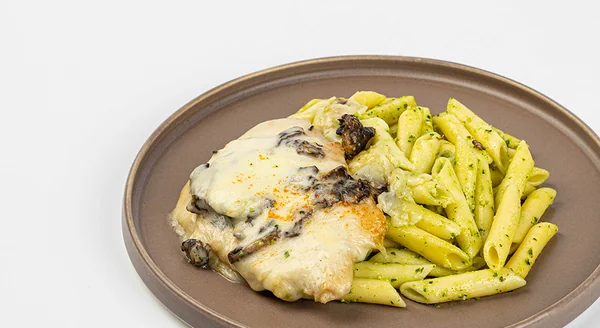 Куриное филе с шампиньонами под ‎шубой‎ из моцареллы. А на гарнир — паста пенне, посыпанная терпким пармезаном и приправленная соусом ‎песто‎.
