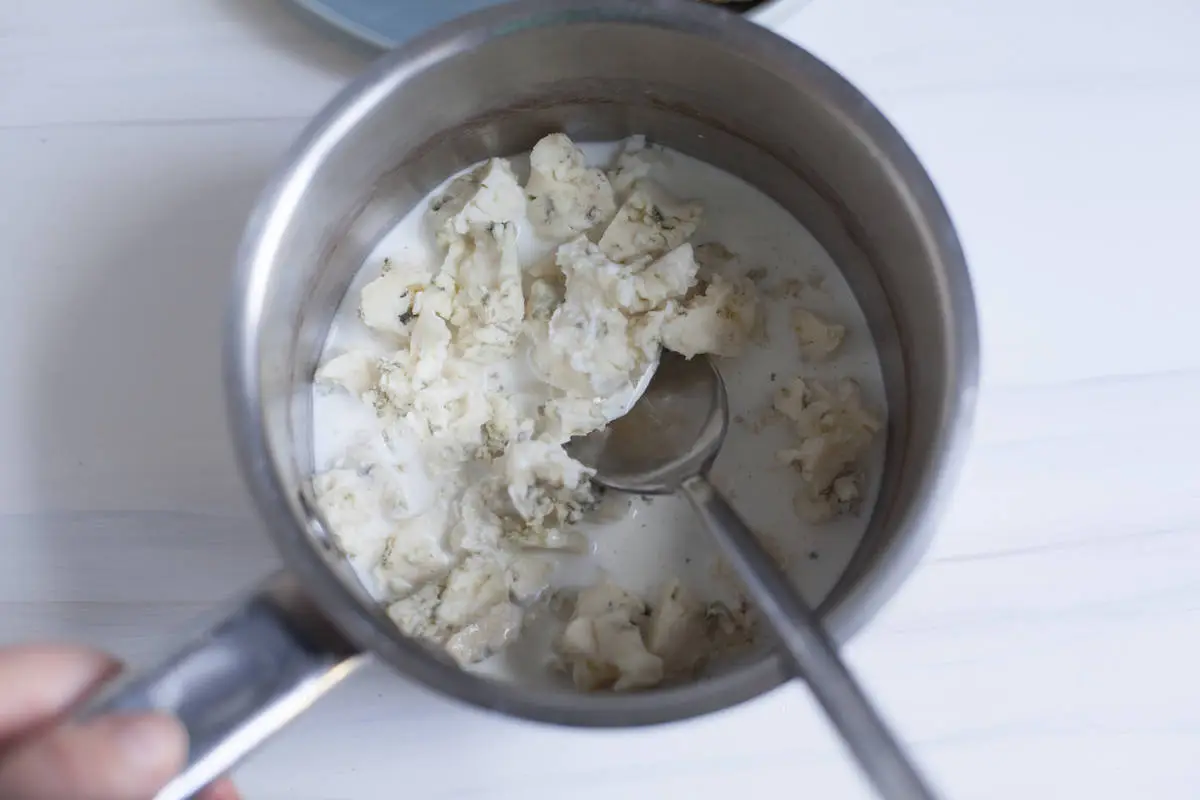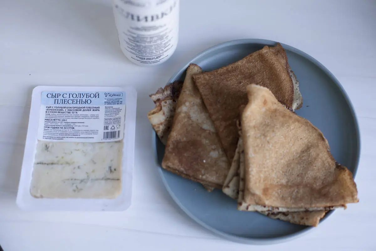 Если нет времени печь блины, то можно взять готовые, зато подать их с соусом из сыра с плесенью — вкусно и небанально! Сыр поломайте кусочками, соедините со сливкам и в небольшом сотейнике или кастрюльке, прогрейте до расплавления сыра. Блинчики подогрейте, подавайте, полив соусом и посыпав орешками.