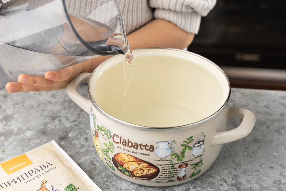 Налейте воду в небольшую кастрюлю, добавьте универсальную приправу, перемешайте и доведите до кипения.