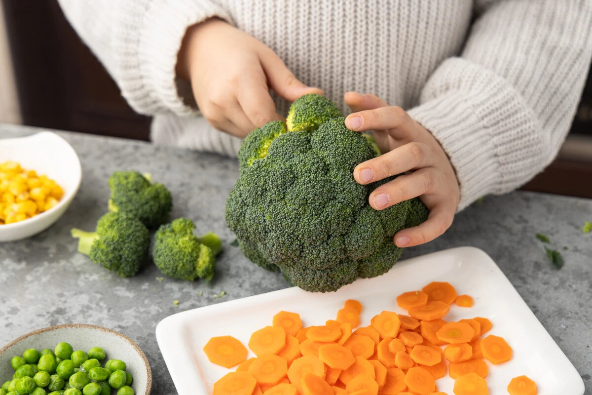 Морковь почистите и нарежьте тонкими кружочками. Лучше взять тонкую и мелкую, но если у вас средняя, нарежьте её четвертинками. У брокколи срежьте мелкие соцветия и порежьте их пополам.