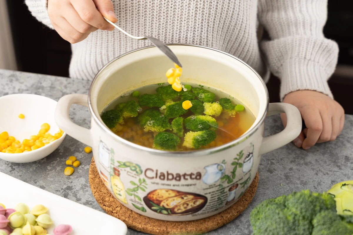 Совет: вместо консервированной кукурузы можно использовать початок — в этом случае снимите с него зёрнышки и добавьте в суп вместе с брокколи.