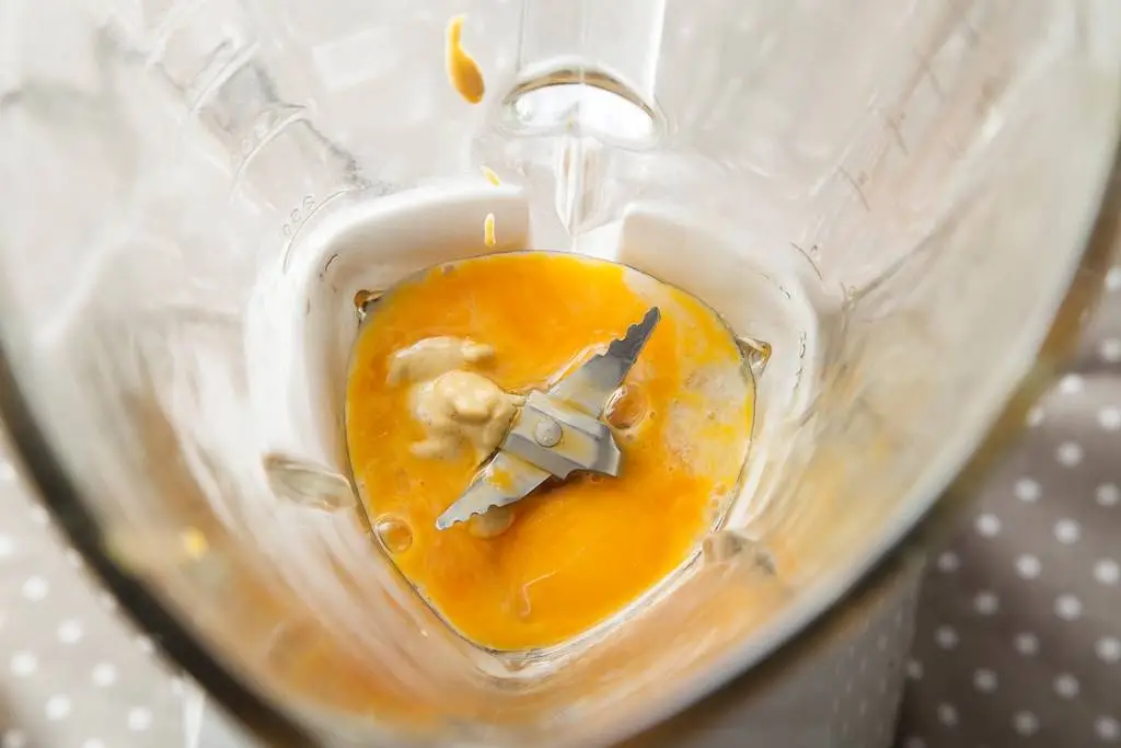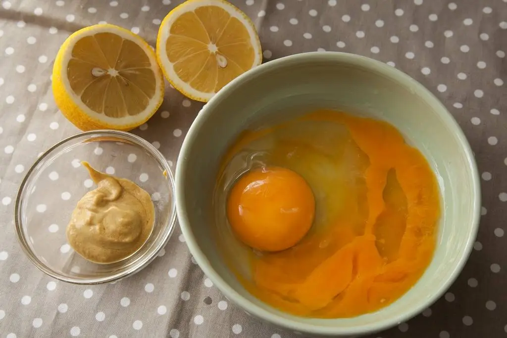 В чашу блендера влейте целое яйцо и желток, добавьте горчицу, посолите и поперчите. Выдавите сок из половины лимона.