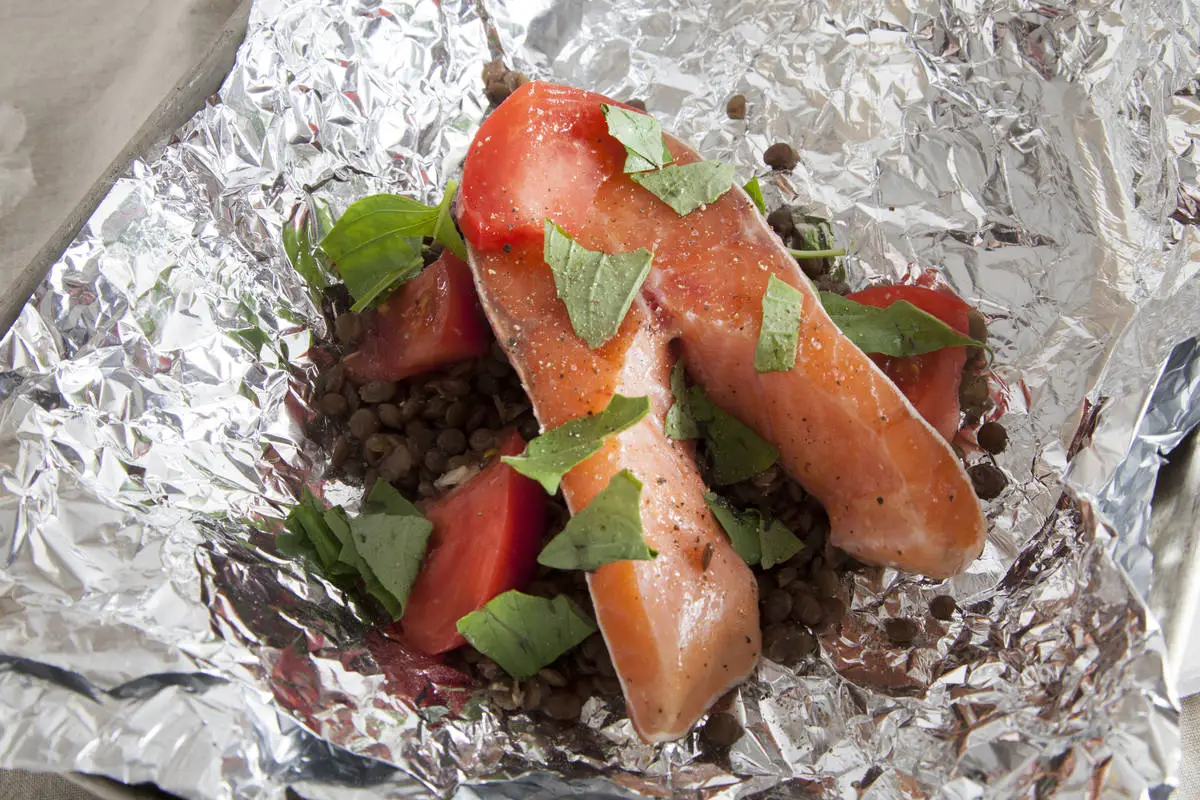 Подготовьте 3 листа фольги, на каждый выложите чечевицу, порезанный кусочками помидор и листья базилика, сверху стейк форели, посолите, поперчите, заверните края фольги.