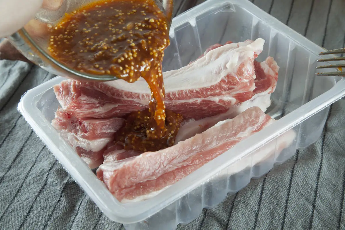 Ребрышки обсушите салфеткой и залейте маринадом, оставьте мариноваться на полчаса при комнатной температуре.