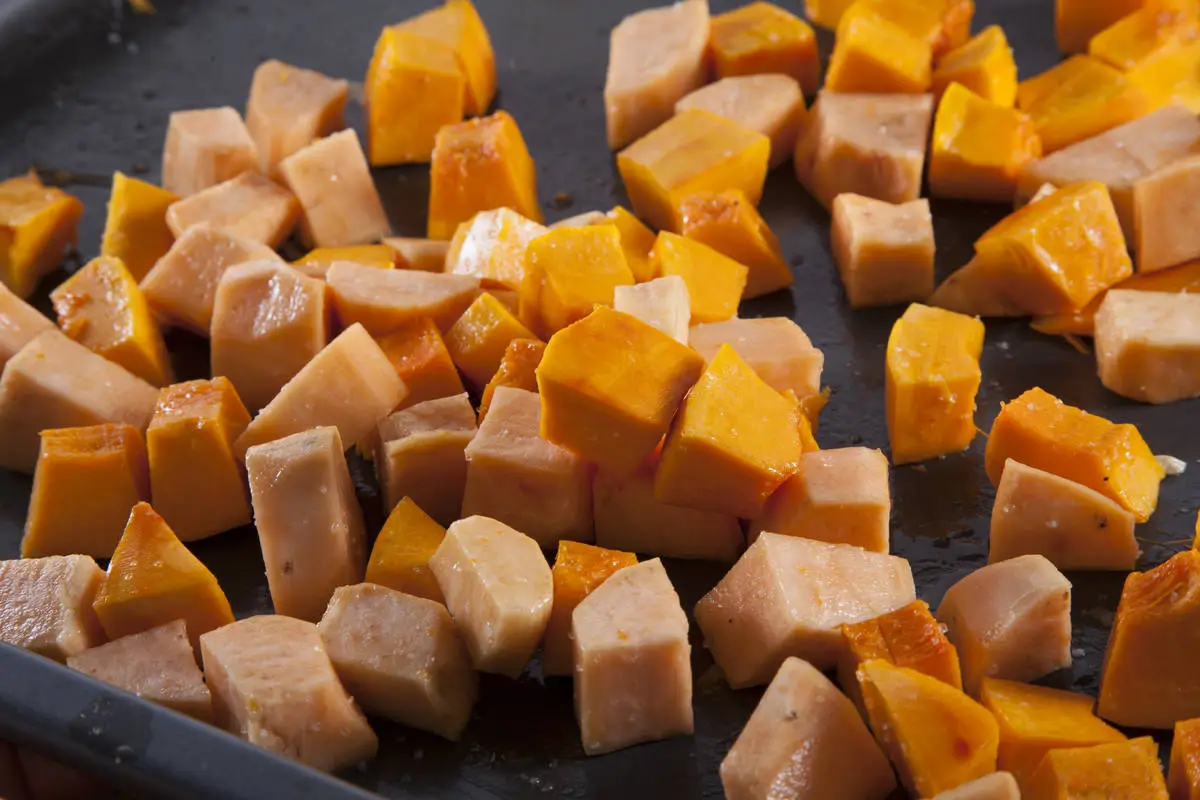 Духовку разогрейте до 180 градуов. На противень выложите батат и тыкву, полейте смесью масла и лимонного сока, посолите, перемешайте и поставьте запекаться.