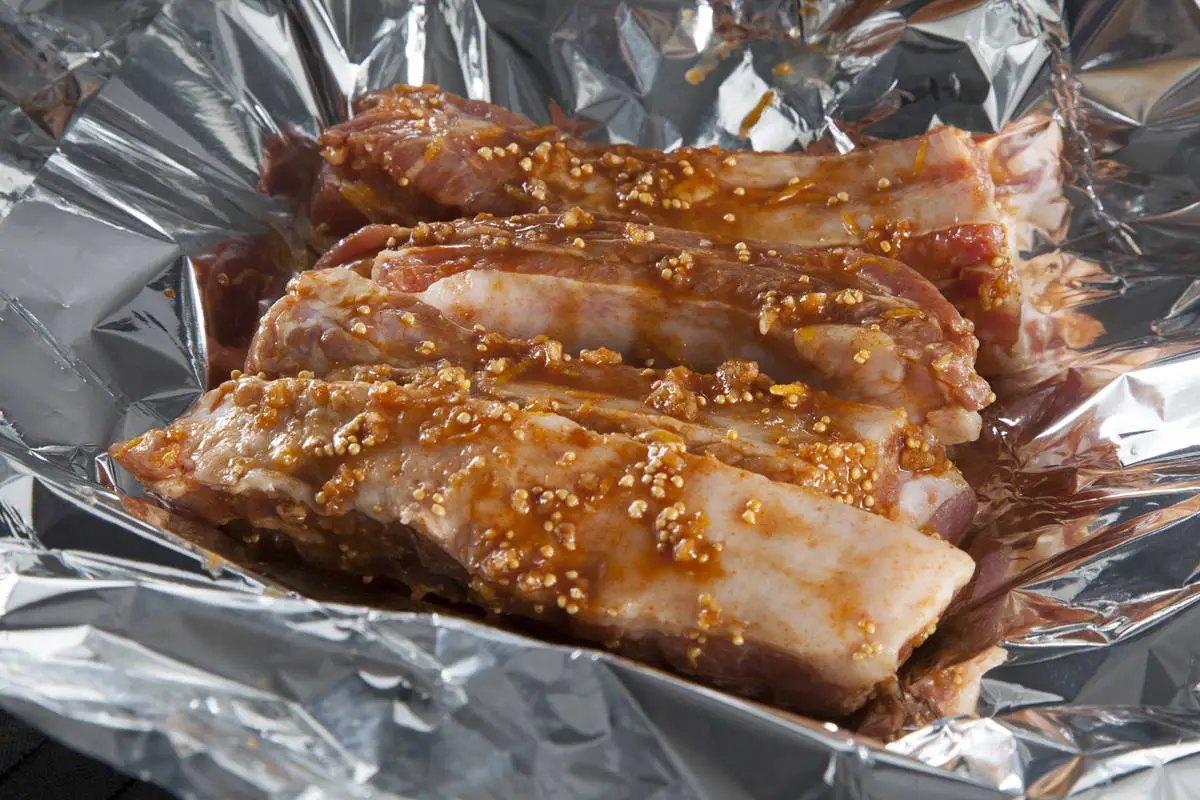 Аккуратно разверните фольгу, чтобы ребрышки могли подрумяниться. Увеличьте температуру до 200 градусов и готовьте еще 15-20 минут. Готовые ребрышки аккуратно выложите на тарелку, подавайте с овощами. Приятного аппетита!