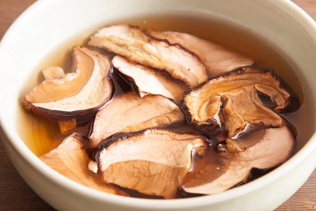 Сушеные грибы залейте стаканом кипятка и оставьте настаиваться.