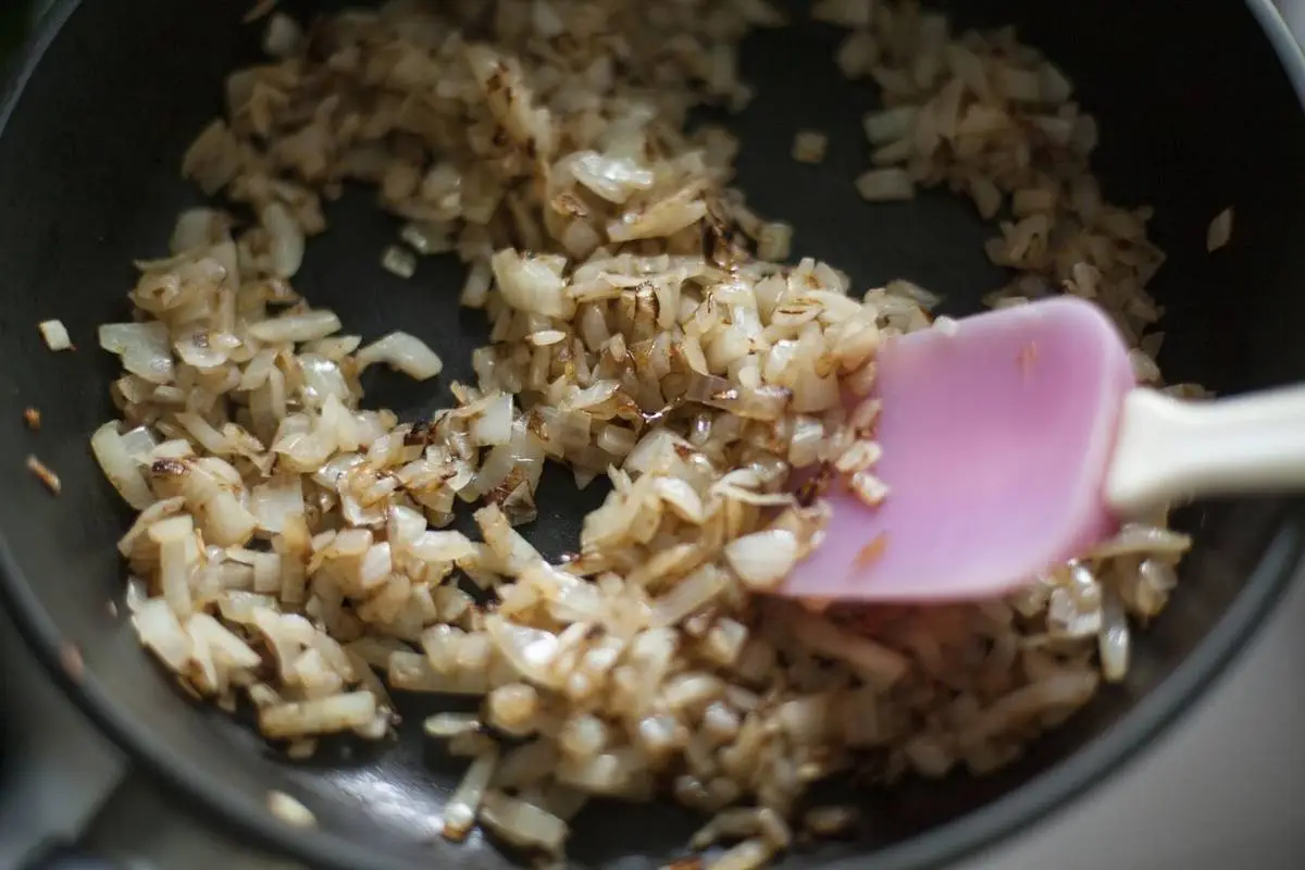Лук мелко нарежьте и обжарьте до золотистости, выложите на тарелку.