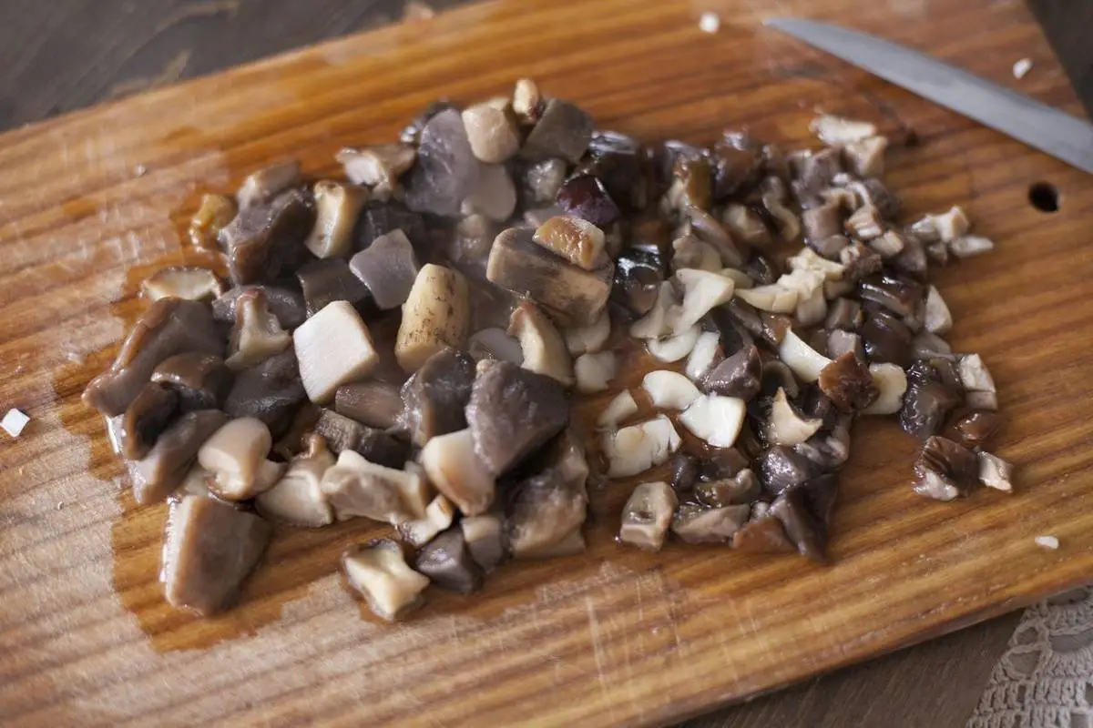 Грибы мелко нарежьте ножом и выложите в сковороду, добавьте масла и жарьте, пока не выпарится лишняя жидкость.