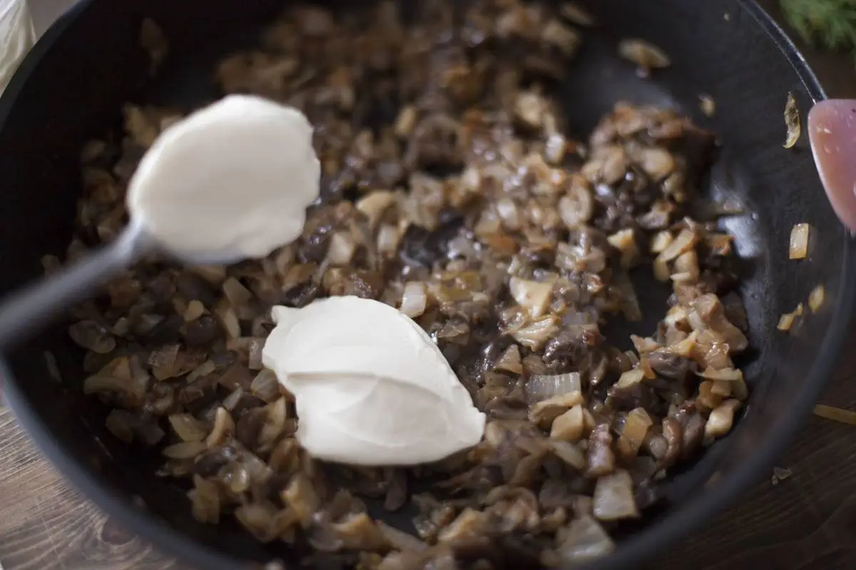 Добавьте к грибам лук и сметану, перемешайте и потушите 5 минут — грибная икра готова.